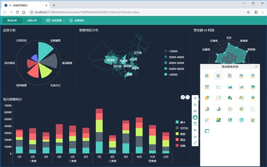 Wyn Enterprise 中具有多屏自适应能力的仪表板,内置丰富的数据可视化类型,而且开放的数据可视化插件功能,几乎可以将任意的可视化组件库集成到产品中,比如:Echarts,D3,ChartJS,三维模型等,充分满足数据可视化大屏等场景的需要。