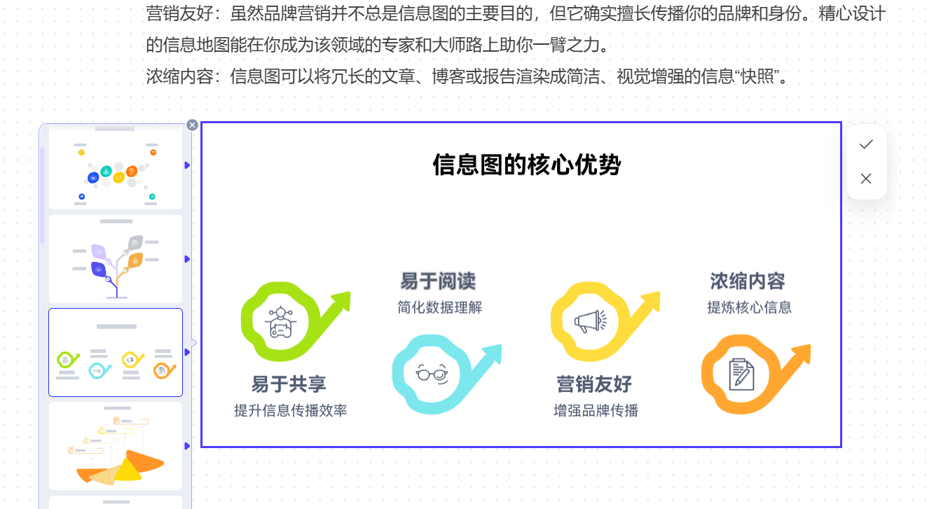 - 浓缩内容:信息图可以将冗长的文章、博客或报告渲染成简洁、视觉增强的信息“快照”。