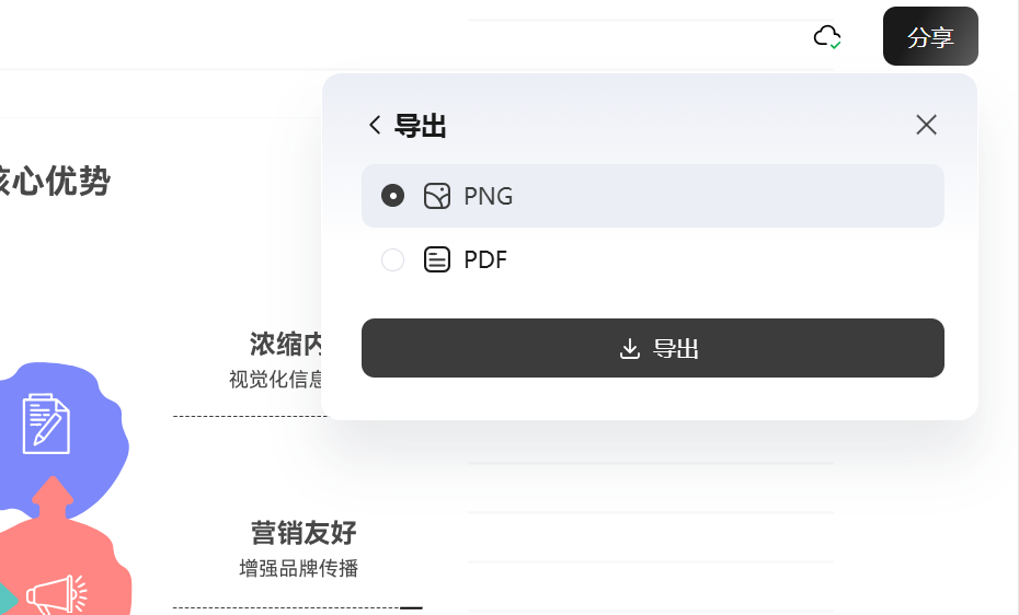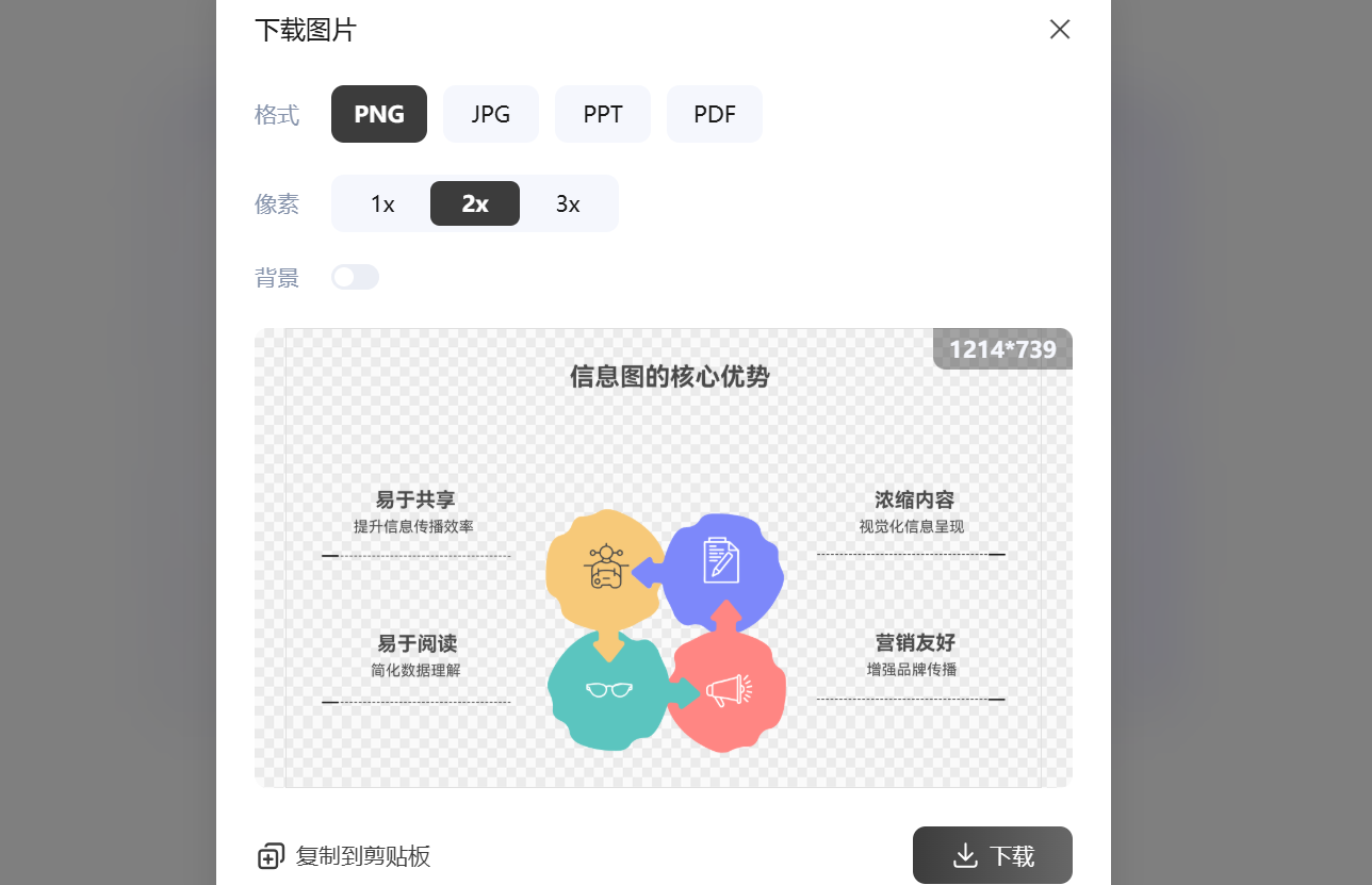 完成后,可以将信息图导出为PNG/JPG的图片格式,方便发送到社交媒体或插入文档;也可以下载为PDF或PPT格式,直接插入工作报告或学术报告的演示材料中,瞬间提升视觉魅力和专业水平。