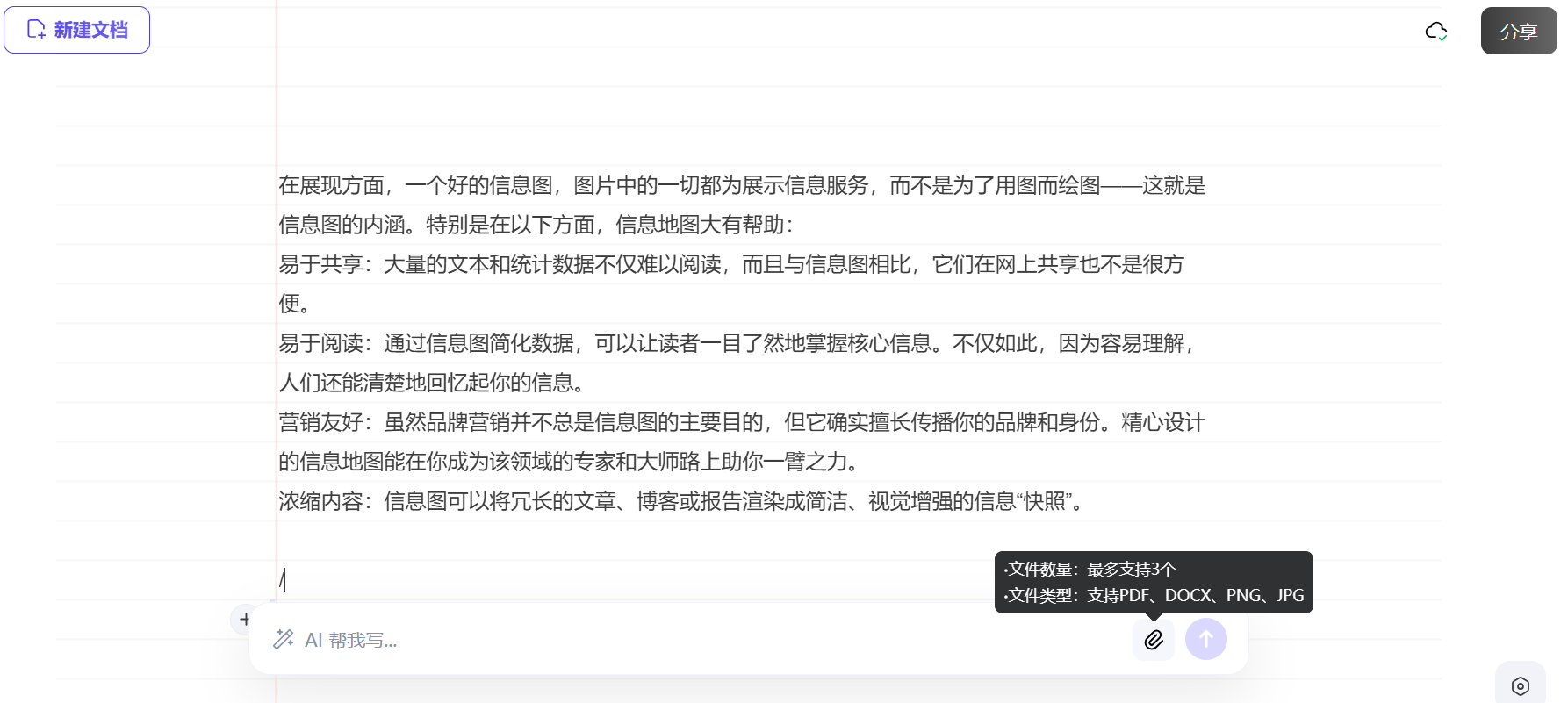 它还支持文档导入(上传PDF/Word/图片,自动提取信息生成图表)和AI帮写(输入关键词自动生成文章框架),特别适合时间紧迫,或懒得梳理文字的用户。