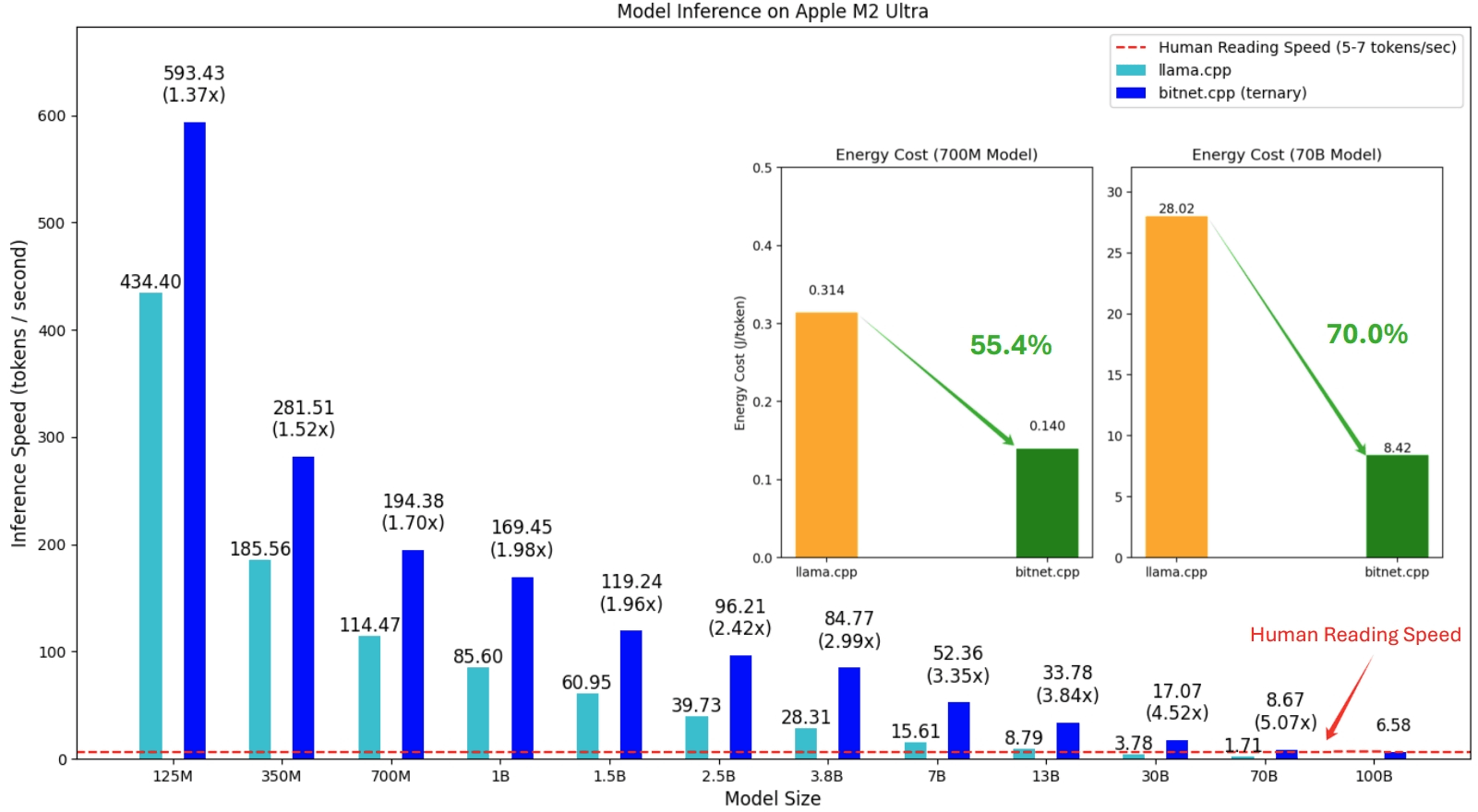 bitnet.cpp 的第一个版本是支持 CPU 上的推理。bitnet.cpp 在 ARM CPU 上实现了 1.37 倍至 5.07 倍的加速,更大的型号体验到更大的性能提升。此外,它还能耗降低了 55.4% 至 70.0%, 进一步提高了整体效率。在 x86 CPU 上,加速范围为 2.37 倍至 6.17 倍 ,能耗降低 71.9% 至 82.2%。 此外,bitnet.cpp 可以在单个 CPU 上运行 100B BitNet b1.58 模型,实现与人类读取相当的速度(每秒 5-7 个标记),显着增强了在本地设备上运行 LLM 的潜力。