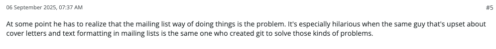 对于这一现象,也有不少工程师觉得问题还是出在了 Linux 用邮件列表的工作方式上,“迟早他得意识到,问题在于邮件列表的工作方式。本身就很滑稽——尤其是当那个对邮件列表里的封面邮件和文本格式抱怨连连的人,恰好又是为了处理这些问题才创造了 Git。”