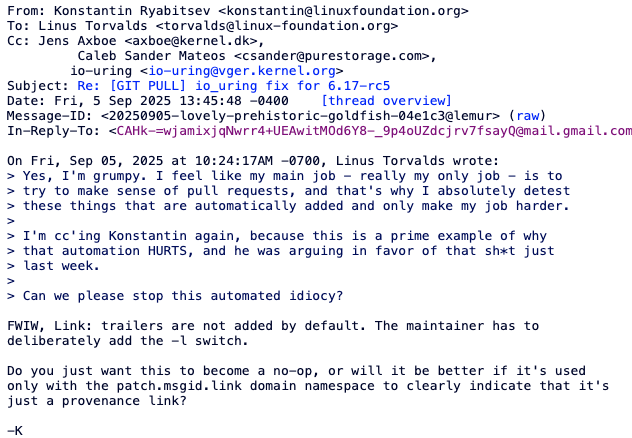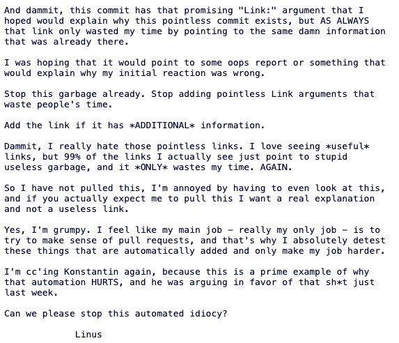 对于这一现象,也有不少工程师觉得问题还是出在了 Linux 用邮件列表的工作方式上,“迟早他得意识到,问题在于邮件列表的工作方式。举个例子,如果是多提交系列补丁的封面邮件,把它的链接放到合并信息里,可能更有用,也没那么烦人。因为当有人在看合并信息时,他们很可能就是在找更宏观的背景信息,或者在解决合并冲突,这时放上初始提交的链接会显得更有相关性。没错,我就是在抱怨。“我希望至少能有一种办法,能阻止大