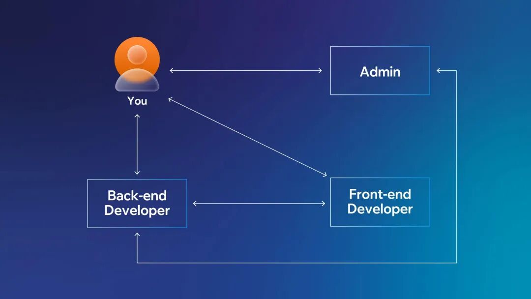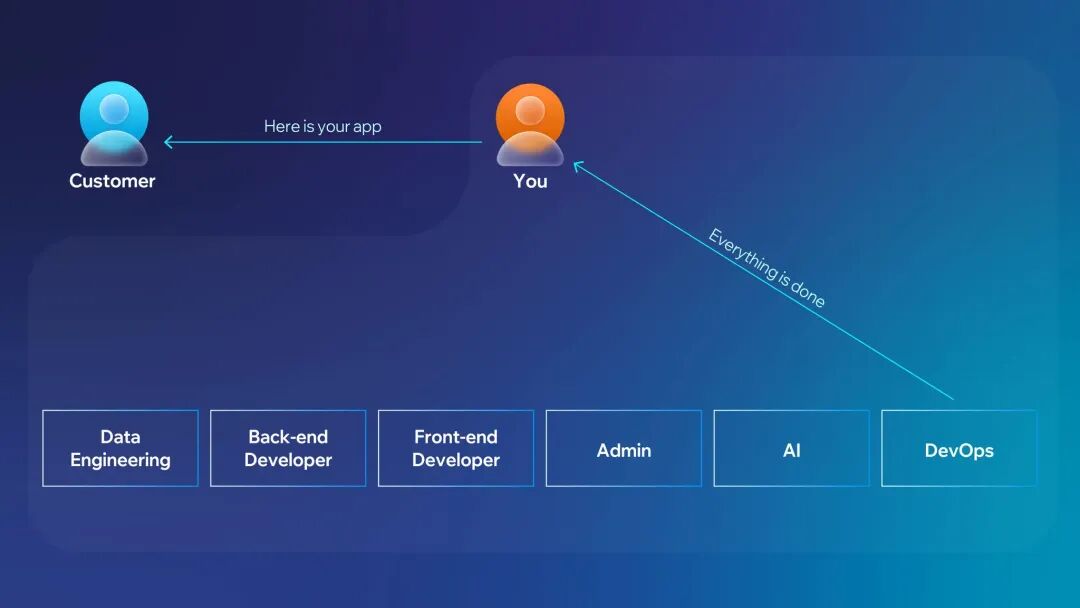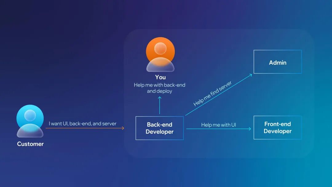 还是同一个客户,这次想要一个完整的应用,需要 UI 界面、多个 API 接口,还要服务器部署。后端开发一个人做不完,就把任务拆分:前端做 UI、行政协调服务器资源、自己开发 API,最后他整合所有部分,交付给客户。