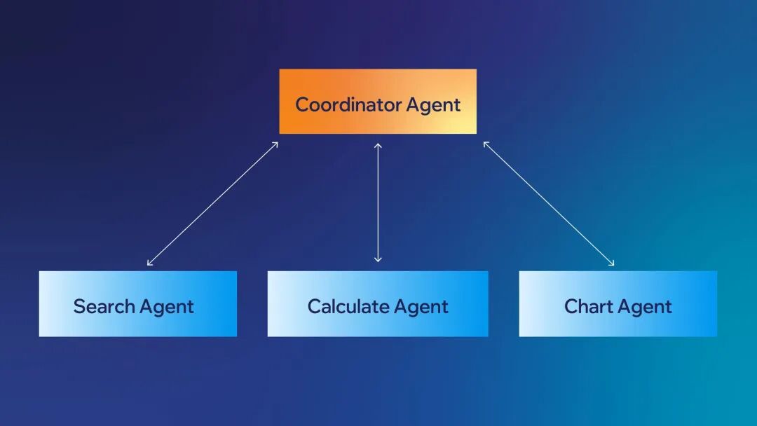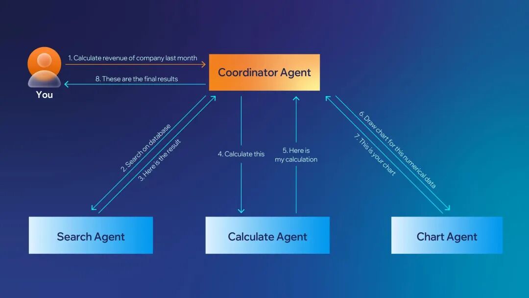 协调智能体先让搜索智能体拉取上月原始数据,拿到数据后再让计算智能体算营收,最后让图表智能体生成图表;