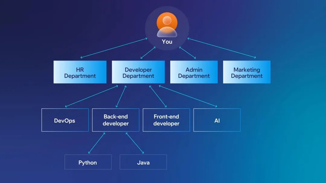 公司慢慢发展,客户和任务越来越多。你希望团队成员专注自己的领域,不用分心找客户;还招了更多专家(比如:AI 工程师、运维工程师),公司结构开始变化。现在大家都归你管,你成了 “中央主管”。客户提需求时先找你:你分析需求后分给合适的人,全程跟进进度;团队成员做完后先向你汇报,你确认没问题再把结果交给客户。