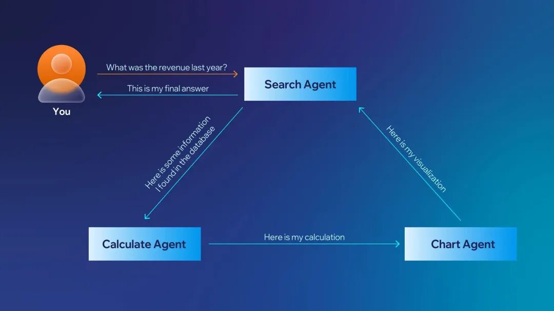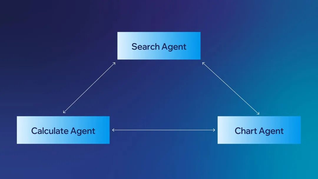 假设有三个智能体:搜索智能体(从数据库拉数据)、计算智能体(处理数值任务)、图表智能体(生成可视化图表)。当你提 “计算公司去年营收” 的需求时: