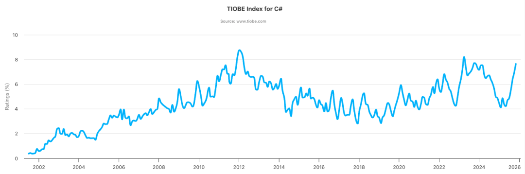 与此同时,微软生态持续扩张,而 C# 依旧是微软最核心、最受支持的语言之一。