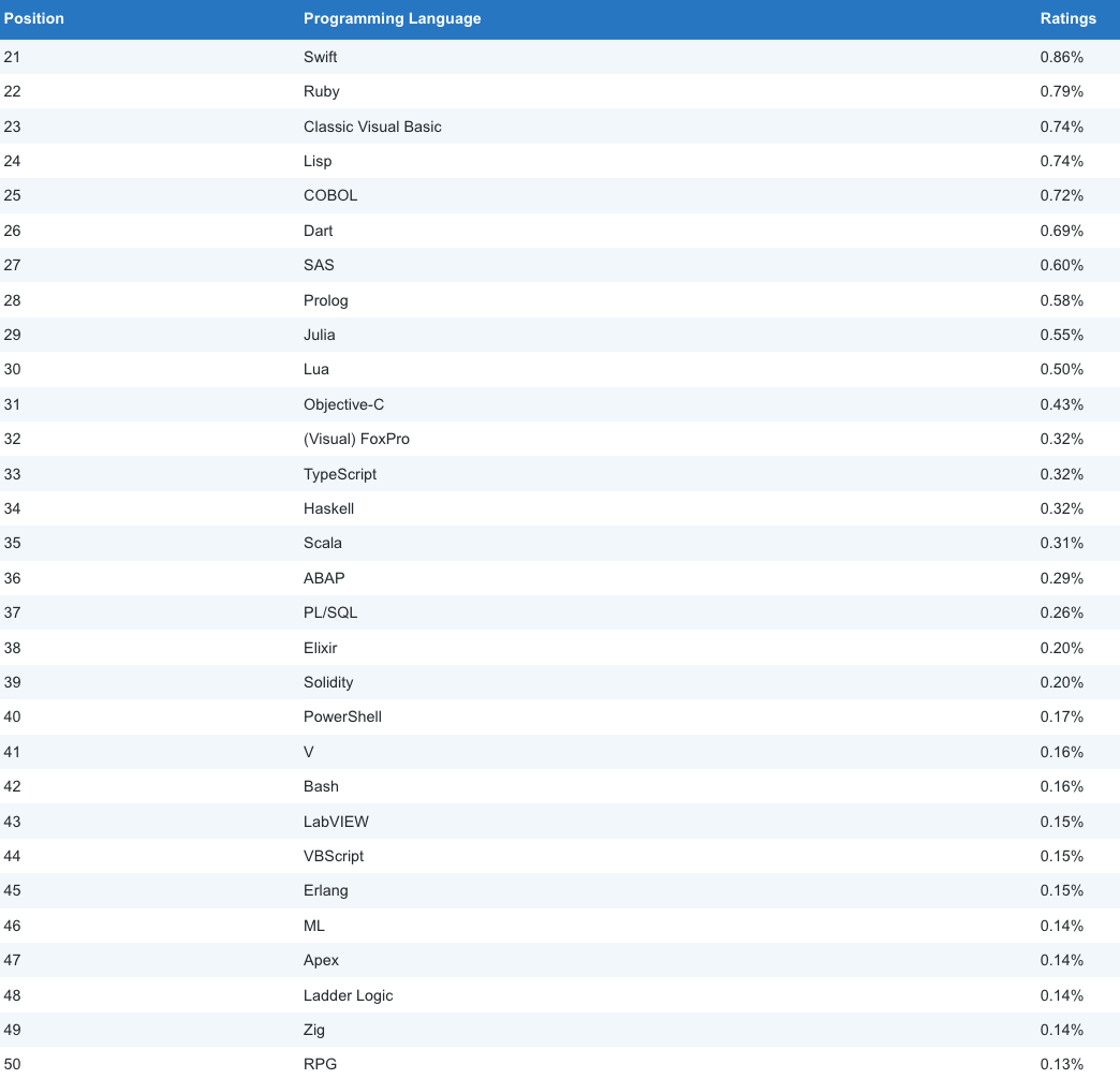 第 51-100 名如下,由于它们之间的数值差异较小,仅以文本形式列出(按字母排序):ActionScript, Algol, Awk, B4X, Caml, CHILL, CLIPS, Clojure, Common Lisp, Crystal, D, Elm, F#, Forth, GAMS, Groovy, Hack, Icon, Inform, Io, JScript, Logo, Maple, Modula-2, Mojo, MQL5, NATURAL, Nim, OCaml, Occam, OpenCL, PL/I, Q, Racket, REXX, S, Scheme, Simulink, Smalltalk, SPARK, SPSS, Stata, SystemVerilog, Tcl, Transact-SQL, VHDL, Wolfram, X++, XC, Xojo
