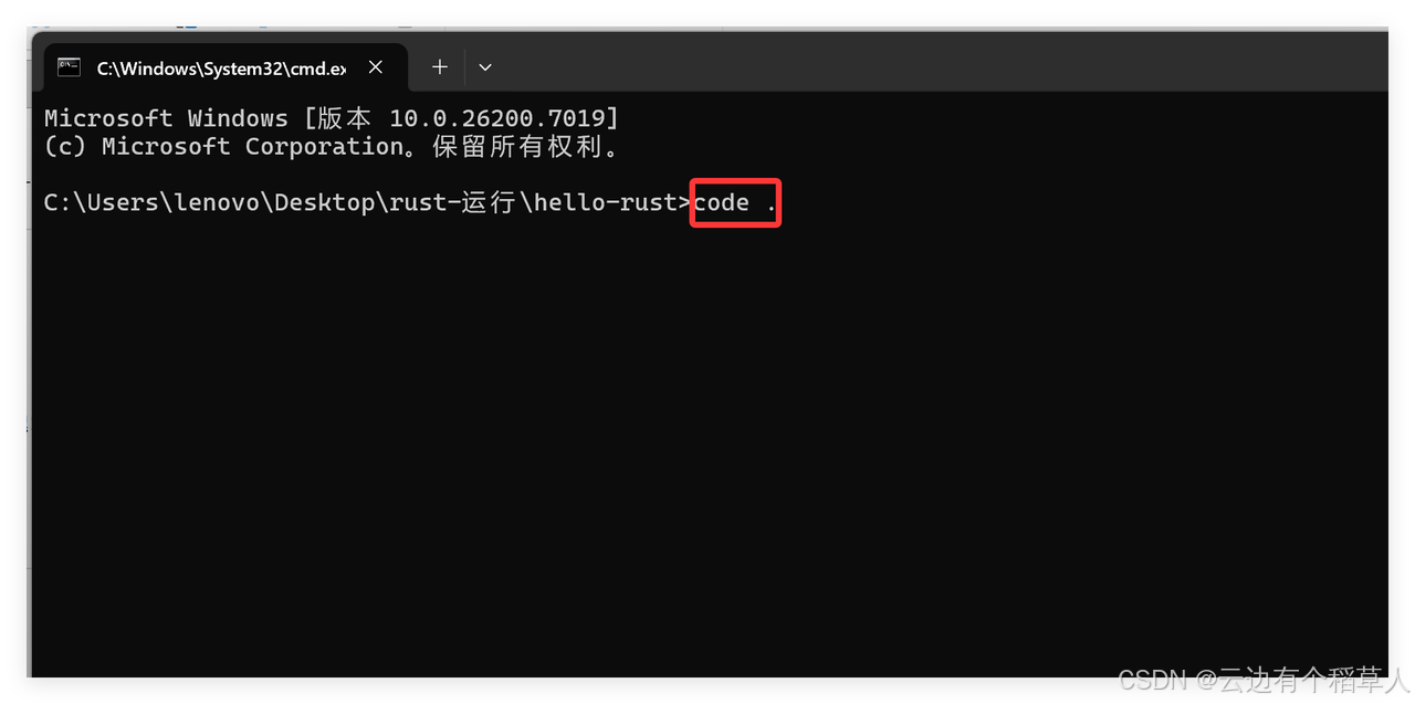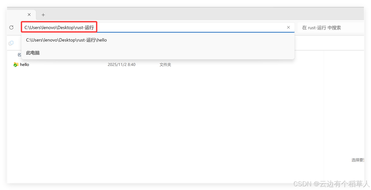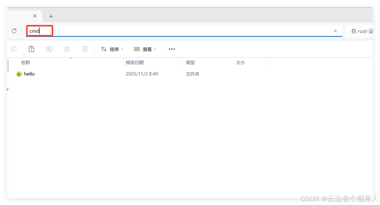 接着点击进入我们新建的 hello-rust 项目,进入之后在上方的路径框内输入cmd