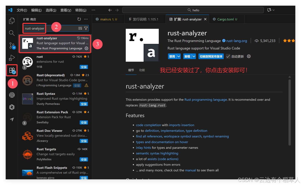 rust-analyzer(必装):官方推荐的 Rust 语言服务器,提供语法高亮、自动补全、错误提示等核心功能