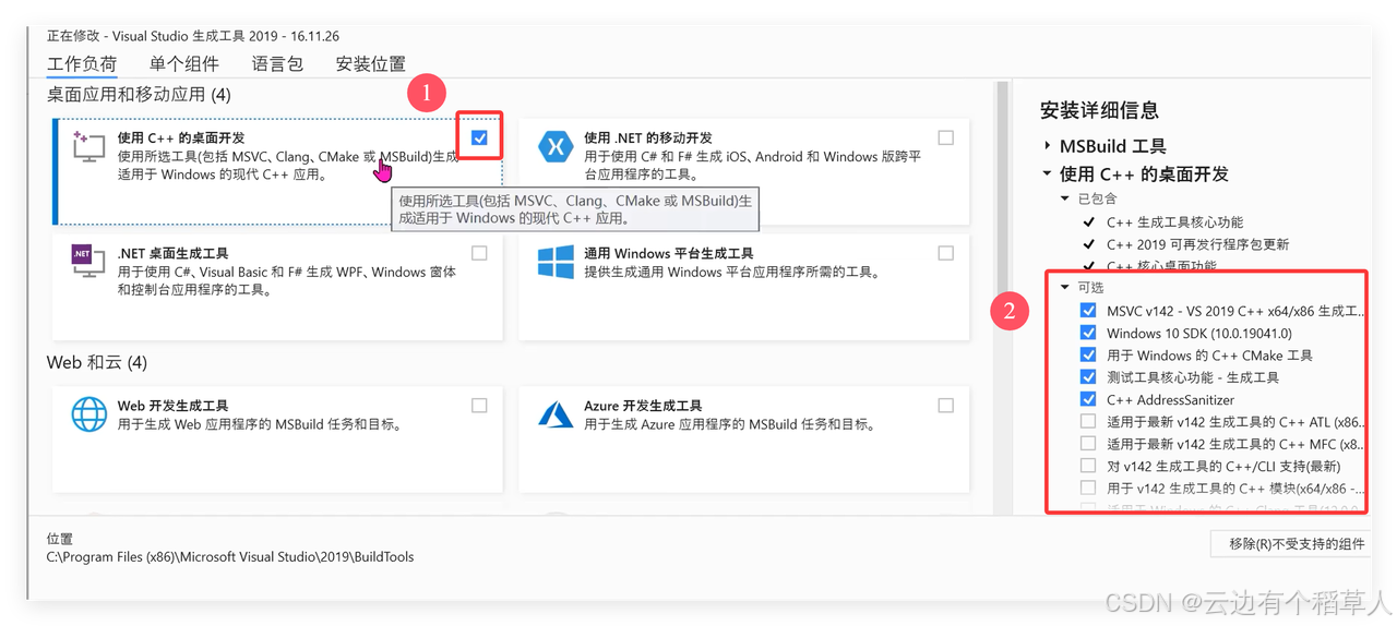 - 在弹出的安装界面中,(1)勾选 「使用 C++ 的桌面开发」(无需勾选其他组件),(2)按照原始的默认勾选即可