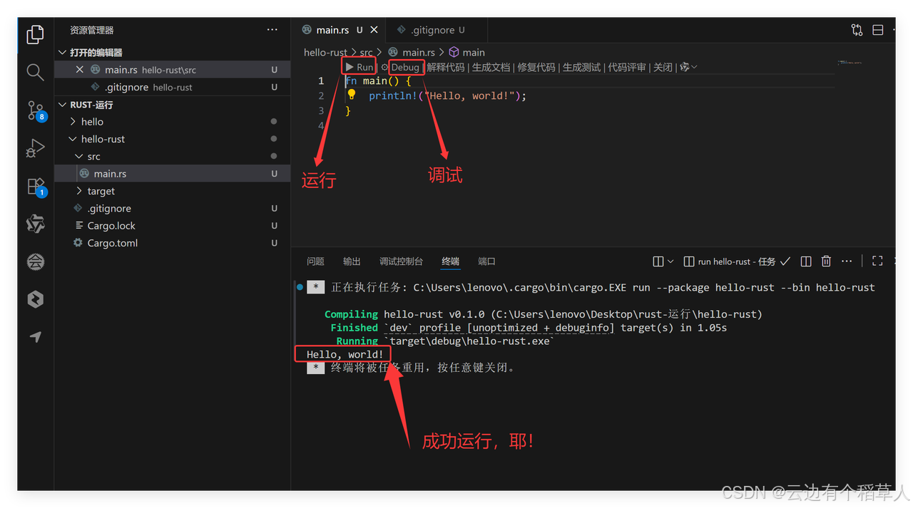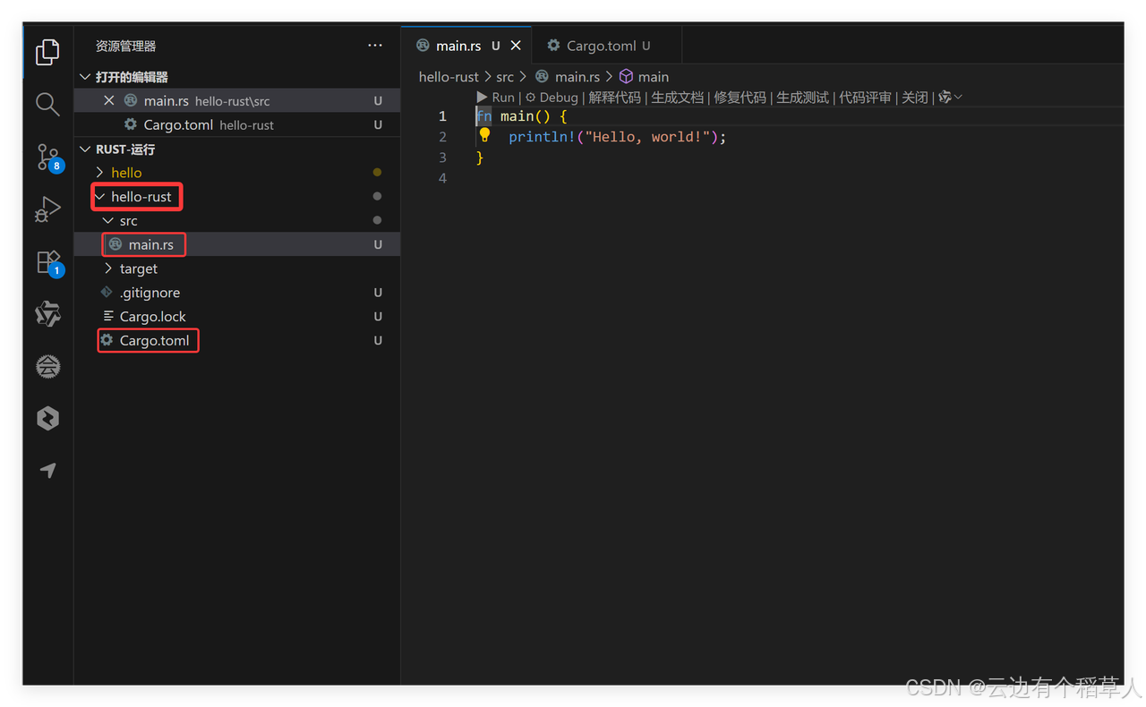 这里有一个我们之前成功建立的名为 hello-rust 的文件夹: