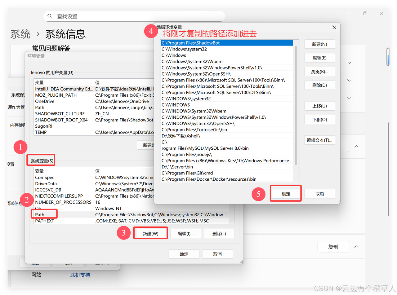 - 「系统变量」→「Path」→「新建」→ 粘贴我们刚才复制的路径 →「确定」