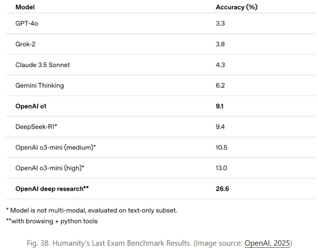 该模型在“人类终极测试(Humanity’s Last Exam)”基准测试(Phan等人,2025)中取得了当前最优(state-of-the-art)结果。该基准测试用于评估AI在多个专业领域回答专家级问题的能力。