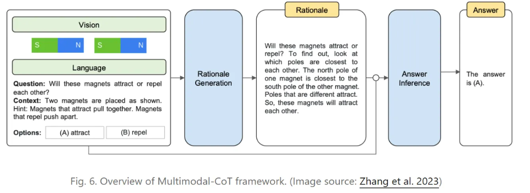 多模态思维链(Multimodal Chain-of-Thought,简称MCoT)(Zhang等人,2023)将文本和视觉信息融入推理过程,打破了传统思维链(CoT)仅依赖语言模态的局限。其框架分为两个阶段:
