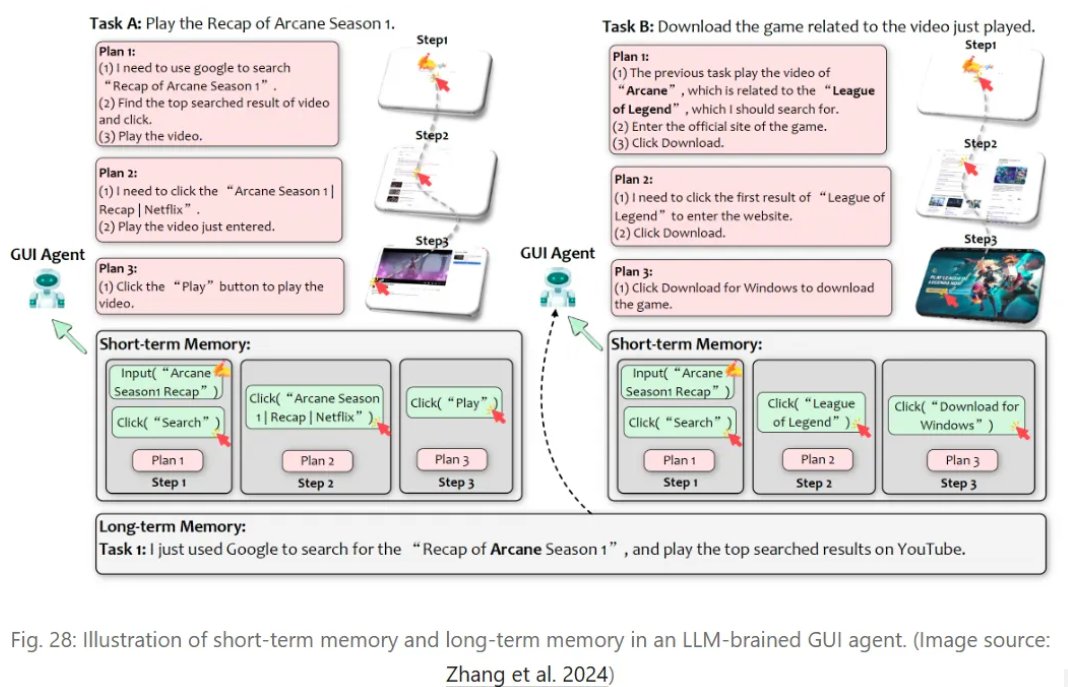 包含短期记忆(利用上下文学习实时捕获任务信息)和长期记忆(通过外部向量存储保存并检索关键信息,确保长期任务的信息连续性)。