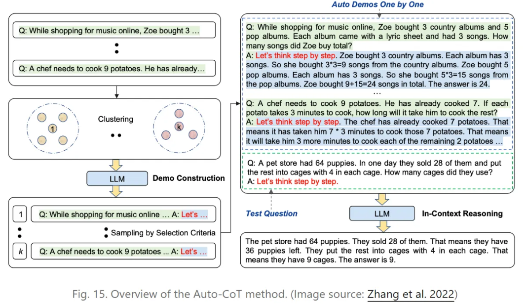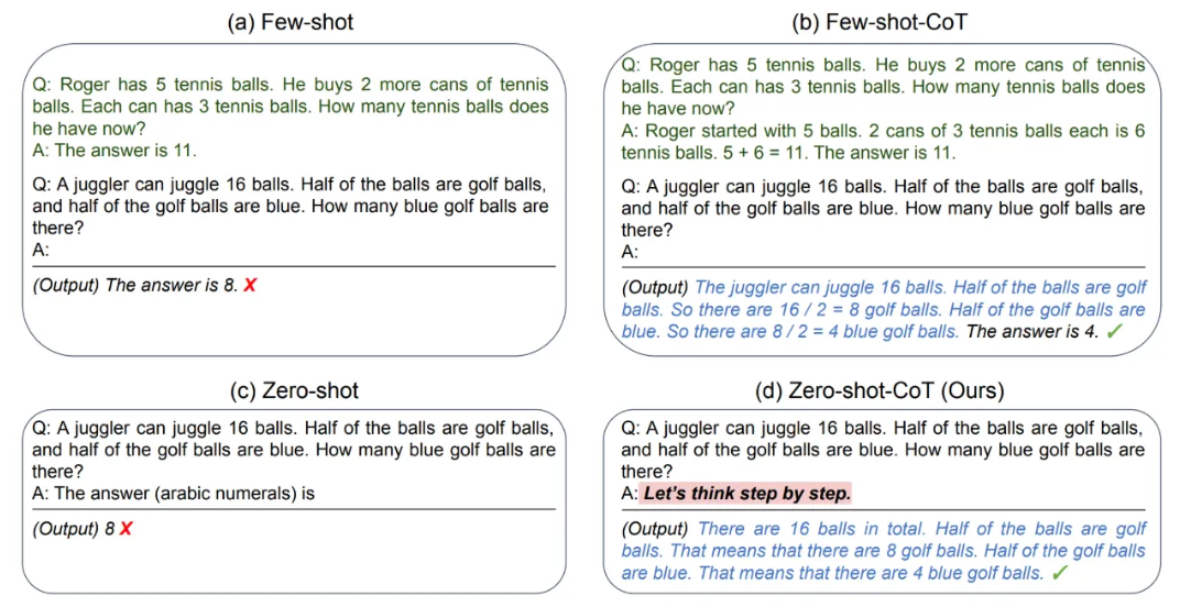 零样本思维链(Zero-Shot CoT,Kojima等人,2022)是思维链(CoT)的后续研究,提出了一种极其简单的零样本提示方法。他们发现,只需在问题末尾简单添加“让我们逐步思考”这一短语,大型语言模型(LLM)就能生成思维链,进而得到更准确的答案。