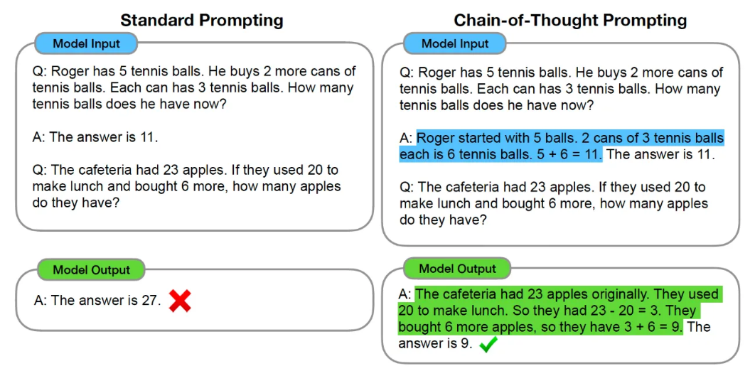 思维链(Chain of Thought,简称CoT)(Wei等人,2022)通过逐步生成一系列短句(即推理步骤)来描述推理过程。其核心目的是明确呈现模型的推理路径,帮助模型更好地处理复杂推理任务。下图展示了少样本提示(左)与思维链提示(右)的差异:少样本提示会得出错误答案,而CoT方法能引导模型逐步陈述推理过程,更清晰地反映模型的逻辑脉络,进而提升答案的准确性与可解释性。