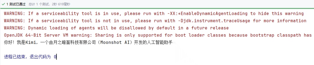 在整个系列中,我调用的大模型是使用的月之暗面(KIMI),为啥用它?因为我早期往里面在充过钱,当然你也可以用其它的,在上一篇文章中也说过,在LangChain4J中切换大模型基本上不需要修改代码,你可以看到Kimi的教程来对像其它大语言模型。