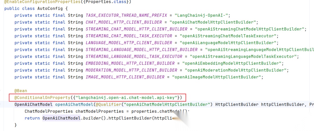 这背后的逻辑其实不复杂:如果你了解 SpringBoot 的自动装配机制,就能轻松想通。关键在于,我们引入的 OpenAI 依赖中,内置了一个 AutoConfig(自动配置)类,整个 ChatModel 的自动装配过程,正是在这个类里完成的。