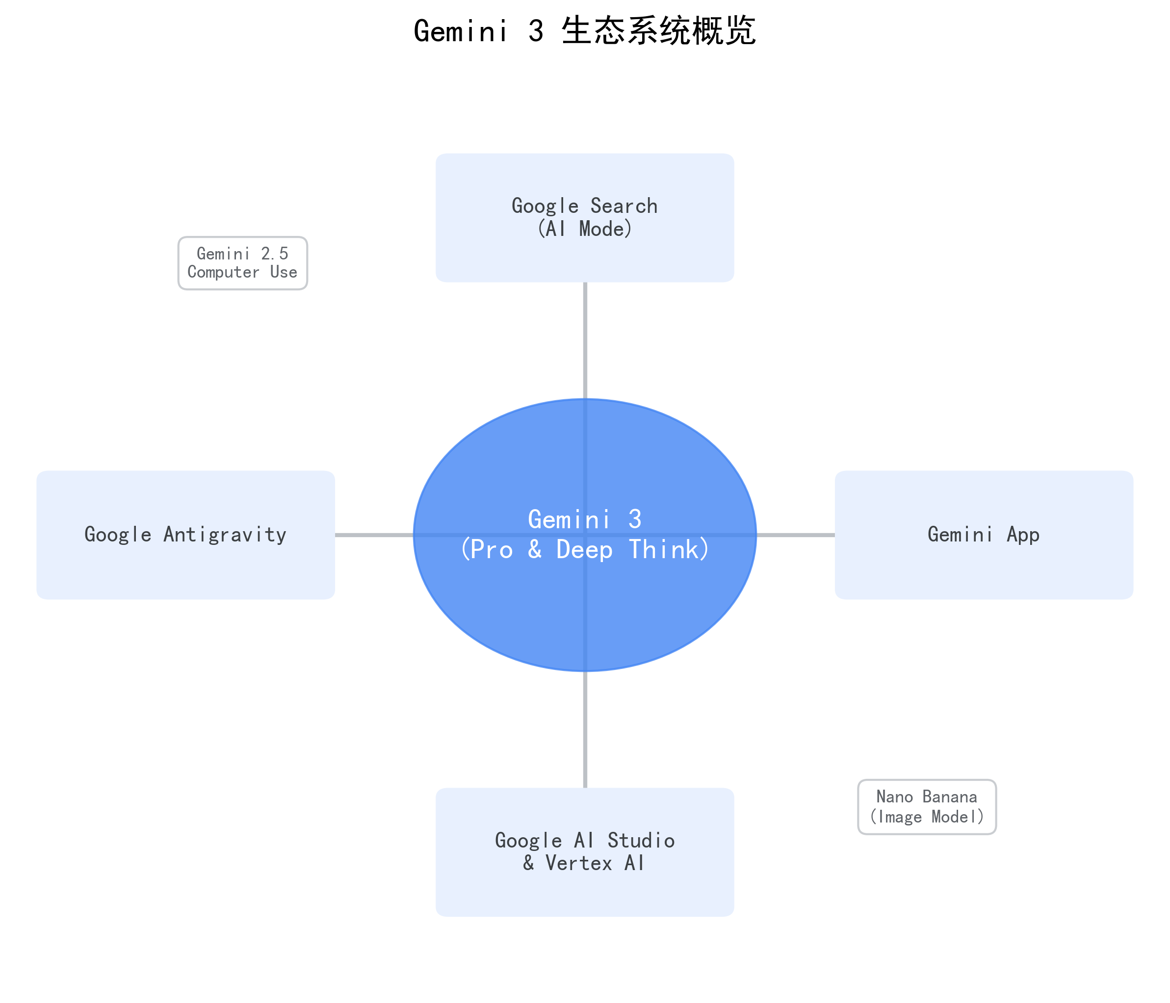 如上图所示,Gemini 3 不仅仅是一个模型,它更像是一个庞大的生态系统的核心心脏,向下支撑着搜索、应用、开发工具,向外辐射出无限的可能。
