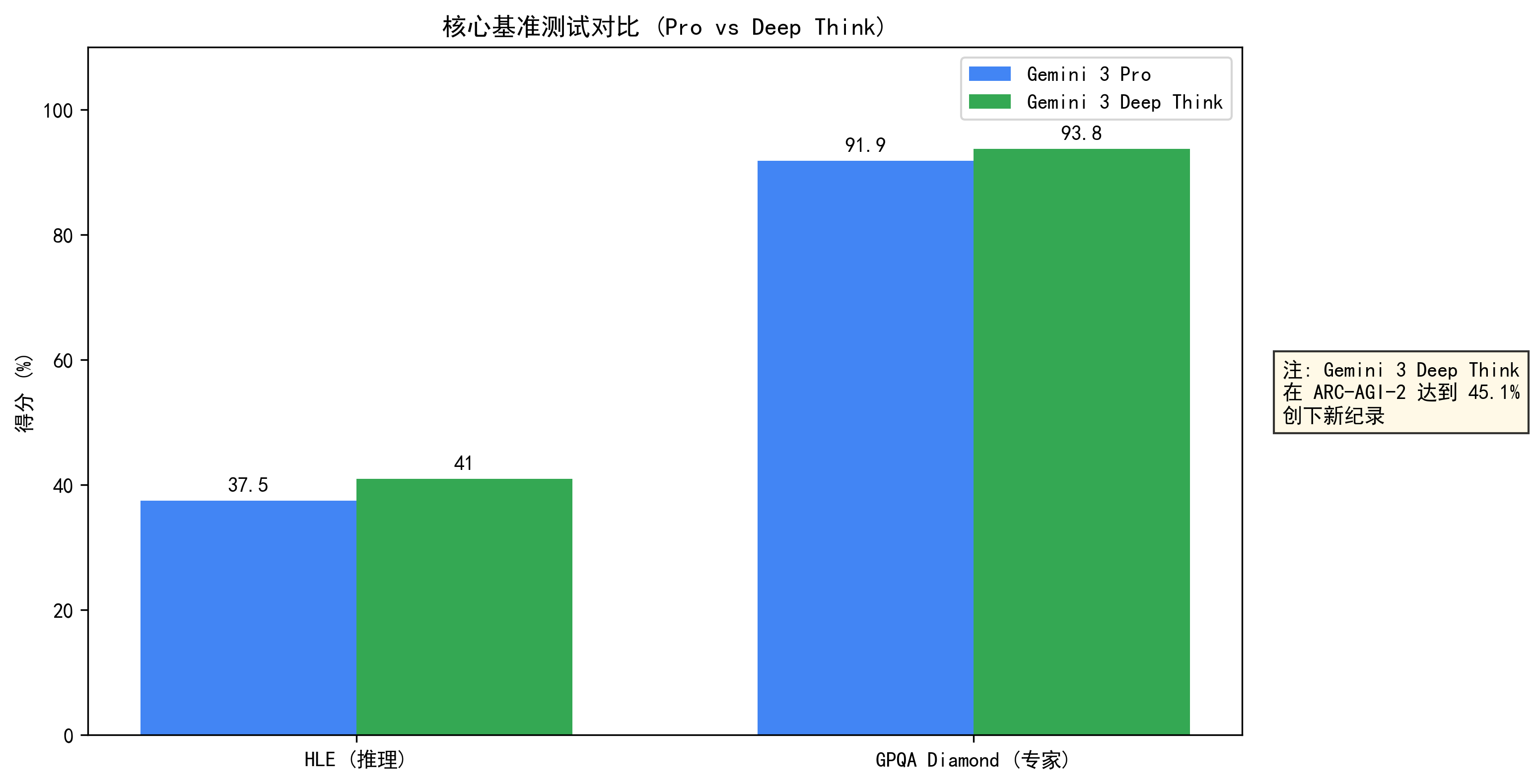 从图表中可以清晰地看到,Gemini 3 Deep Think 在推理(HLE)和专家知识(GPQA Diamond)上都展现出了显著的优势。特别是在 ARC-AGI-2 这个被认为是通往通用人工智能(AGI)关键里程碑的测试中,它更是拿下了 45.1% 的历史新高。