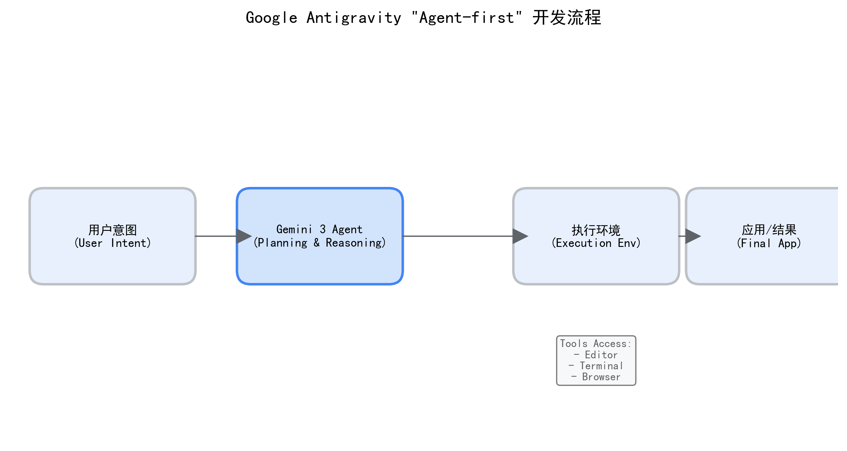 在这个流程中,Gemini 3 Agent 处于核心指挥官的位置。它不像以前那样只能给建议,而是被赋予了直接访问 编辑器 (Editor)、终端 (Terminal) 和 浏览器 (Browser) 的权限。