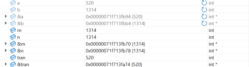 可以看出,a、b和m、n的地址并不一样,所以这里的Swap函数仅仅单纯实现了传值操作,并没有实现传址操作这一根本性的操作。