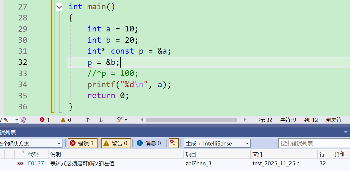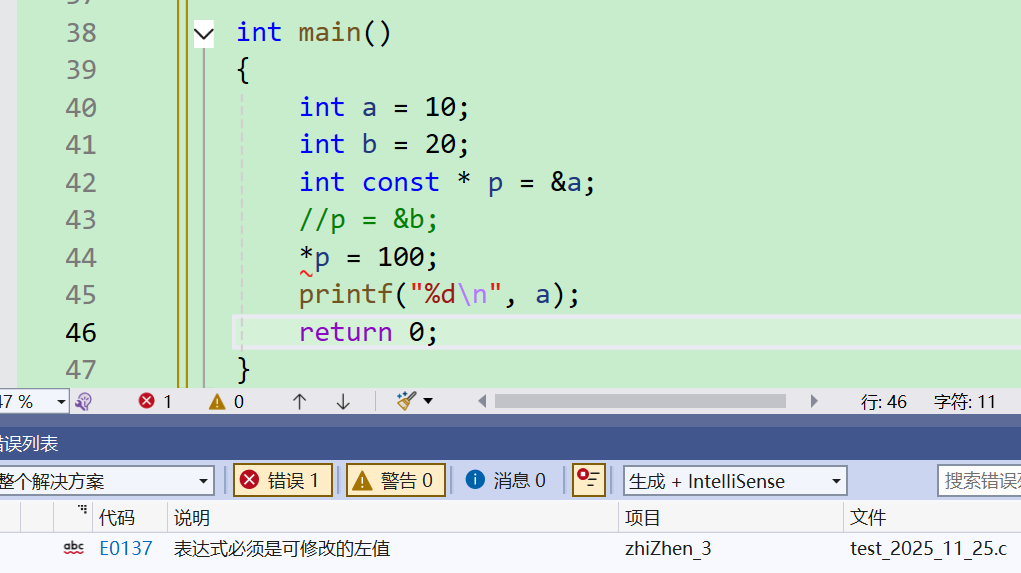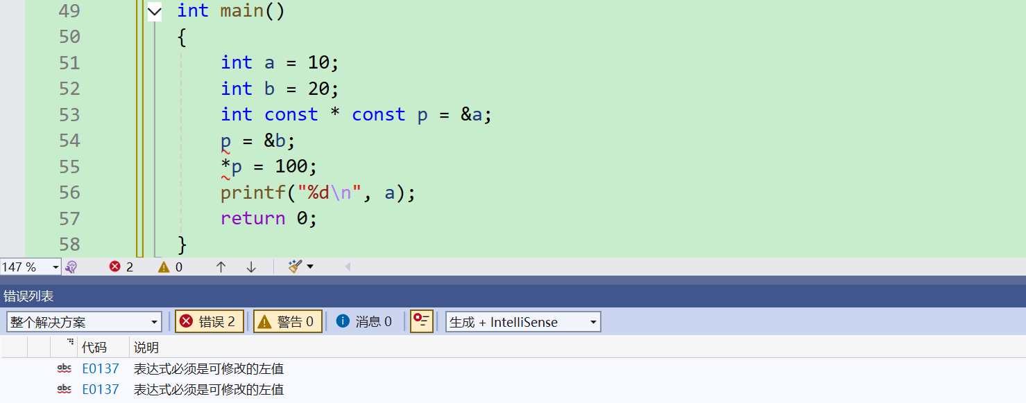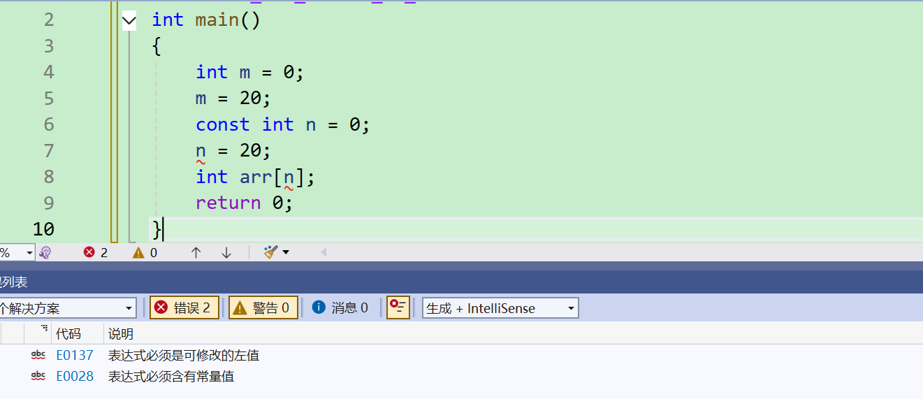 通过上述代码及编译结果我们可以看出,使用const修饰的n具有常属性,即不能被修改。