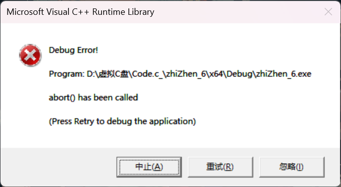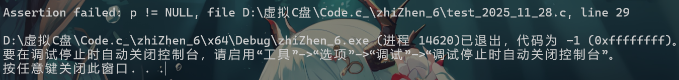上述代码在程序运行到assert时,会验证变量p是否等于NULL。如果确实不等于NULL,程序继续运行,否则就会终止运行,并且给出报错的信息提示。