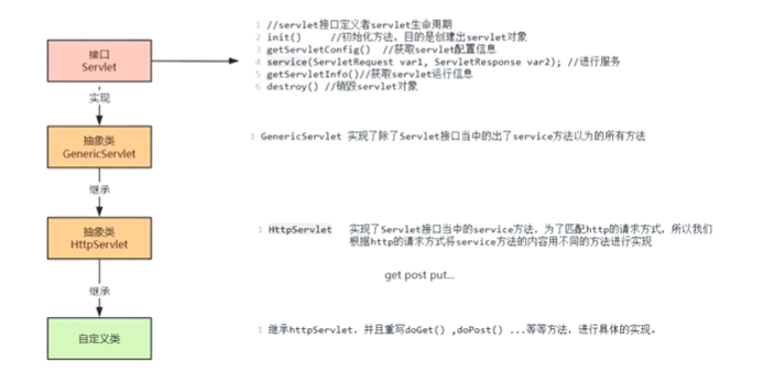 Servlet 并非独立的 “类”,而是一套请求处理的接口规范,其设计采用 “接口 - 抽象类 - 业务实现” 的分层模式,降低了开发复杂度。