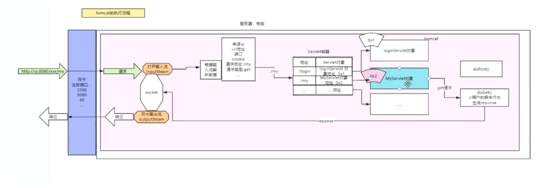 Tomcat 将HttpServletRequest和HttpServletResponse对象传入 Servlet 的service()方法,通过HttpServlet的方法分发逻辑,最终执行自定义 Servlet 中重写的doGet()/doPost()方法。