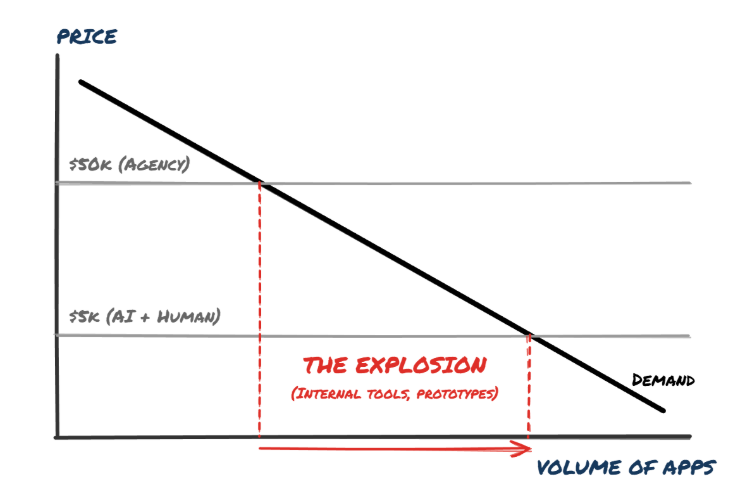 几乎每家公司都有几百甚至几千份 Excel 表格在记录关键业务流程,而这些东西本该做成 SaaS。如果一家外包公司报价 5 万美元来把其中一个做成应用,那只有最核心的项目能立项。但如果成本降到 5000 美元(找个不错的开发者配合 AI 工具即可),那就完全是另一个世界——需求会大爆发。