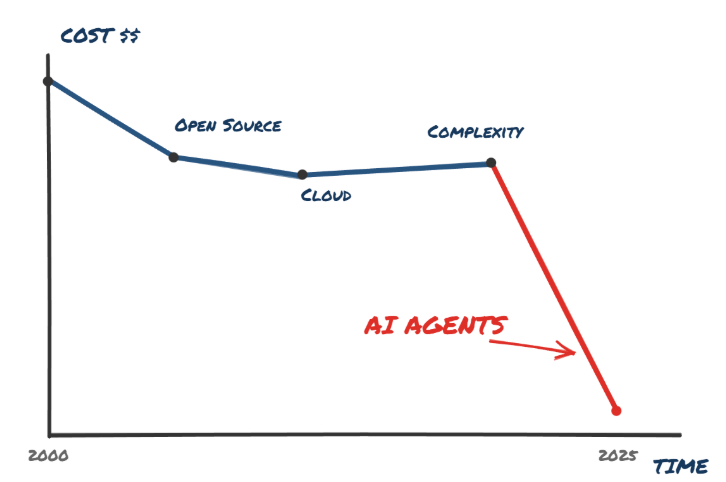 我开始做开发的时候,正好赶上开源开始大规模兴起——而那算是自定义软件开发成本的第一波大幅下降。我还记得,当年用 SQL Server 或 Oracle 的授权费用高得离谱,所以我从一开始就用开源 MySQL,它让你能构建定制化的网络应用,而不用承担动辄五六位数的年度数据库授权费。