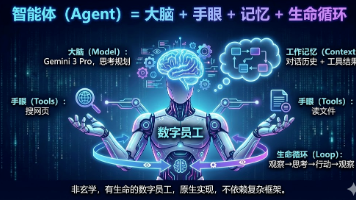 最近Hugging Face工程师Phil Schmid发布了一篇爆款教程,用Gemini 3从零开始演示:智能体本质上就是“LLM + 工具 + 循环”的组合。全程不到100行Python代码,就能实现一个能读写文件、交互对话的 CLI 智能体,全程无复杂框架!